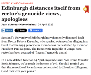 “Scotland’s University of Edinburgh has vehemently distanced itself from Rector Debora Kayembe, who sparked outrage after alleging in a tweet that the 1994 genocide in Rwanda was orchestrated by Rwandan President Paul Kagame. The Democratic Republic of Congo-born rector has been accused of “flagrant” genocide denial. In a now-deleted tweet on 14 April, Kayembe said: “Mr Prime Minister Boris Johnson, we’ve reach the bottom of evil. Should I remind you that the genocide of Rwanda was orchestrated by [President] Kagame. Good luck with your plans.” (“Edinburgh distances itself from rector’s genocide views, apologisesUniversity World News, by Jean d’Amour Mbonyinshunti, 28 April 2022)
