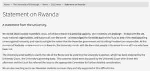 “The University of Edinburgh – in step with the UN, multi-national organisations, and nations all over the world – acknowledges the Genocide against the Tutsi as one of the most appalling crimes against humanity; and rejects outright the notion that the Rwandan government and its sitting President are responsible.” (Statement by the University of Edinburgh following Deborah Kayembe’s denialist statement).