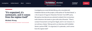Michela Wrong systematically uses the terms “genocide in Rwanda” and “Rwandan genocide” in her interviews and publications. For example, in one of her recent articles in Foreign Affairs, titled “Kagame’s Revenge: Why Rwanda’s Leader Is Sowing Chaos in Congo” (May/June 2023), she refers to “Rwanda’s 1994 genocide.” In her book Do Not Disturb: The Story of a Political Murder and an African Regime Gone Bad (2021), the phrase “Rwandan genocide” appears on the back cover, while “the genocide” or “the 1994 genocide” appear about 40 times throughout the book—not counting instances where the phrase is used in reported speech.